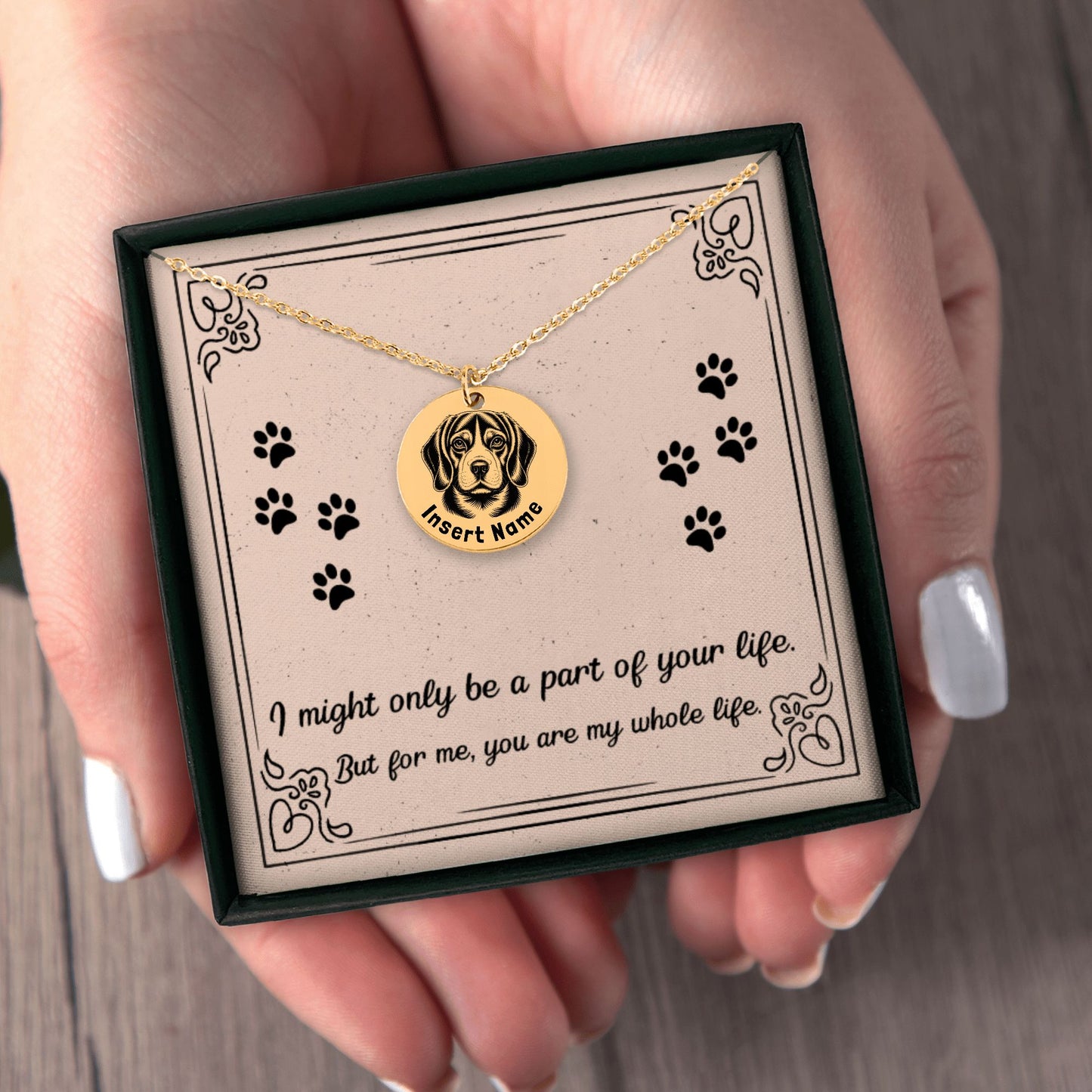 Personalized Beagle engraved necklace in jewelry box with message card.