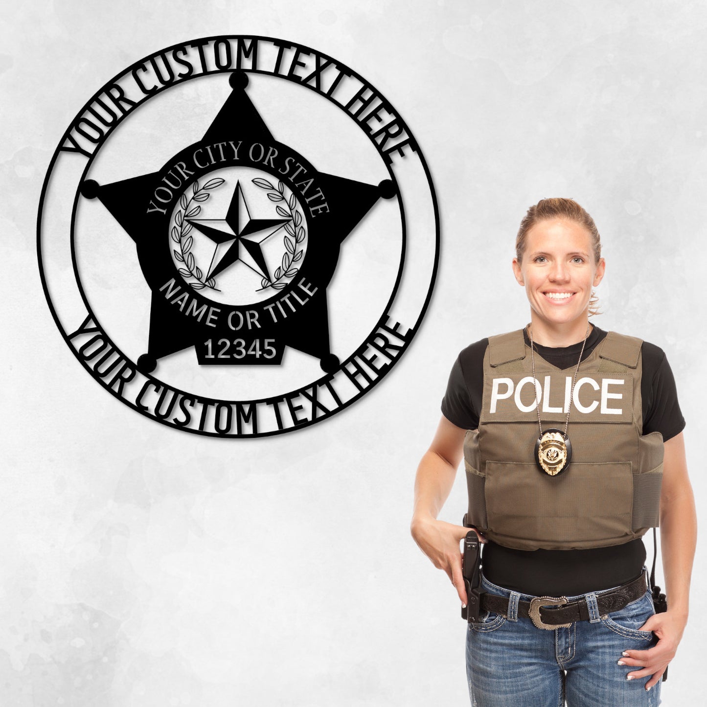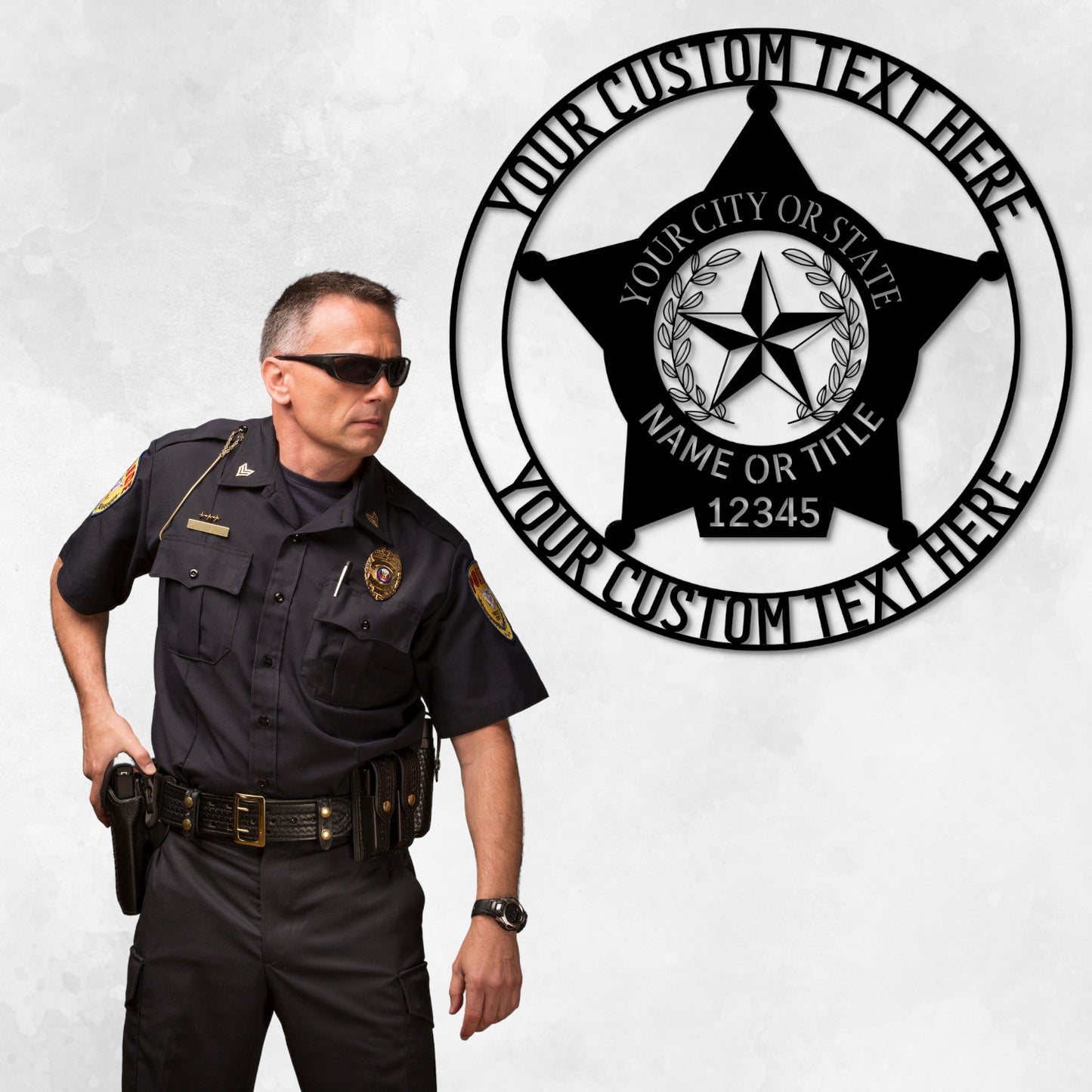 Design your personalized police 5-point star badge metal sign today and add a unique name, text, or date. This customizable law enforcement police wall decor is the perfect display for a man cave, police department, or living room, and could be a one-of-a-kind cop wall art sign gift to yourself or a policeman or policewoman. E.g. police officer badge name monogram gift for a birthday, Christmas, anniversary, retirement, Mother's Day, Father's Day, or housewarming.