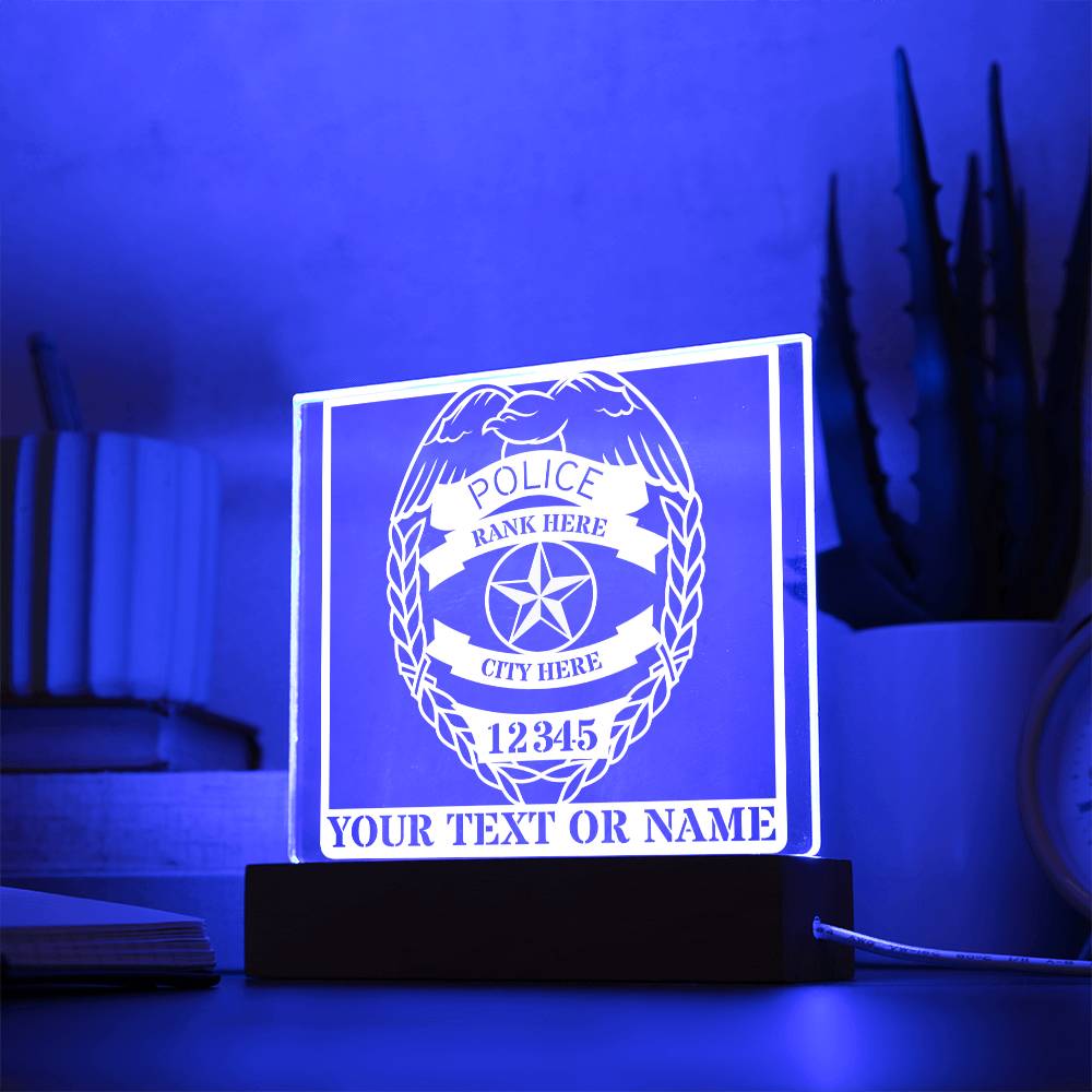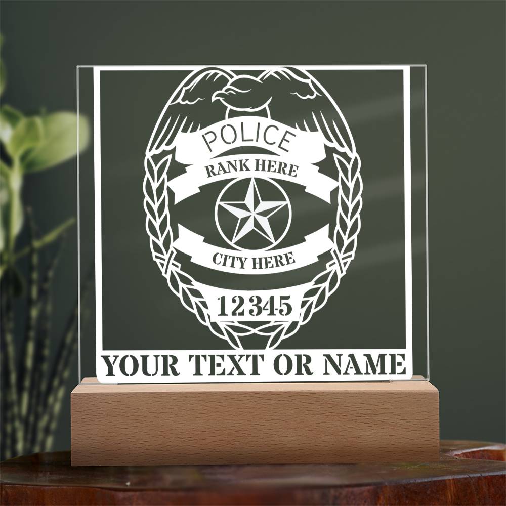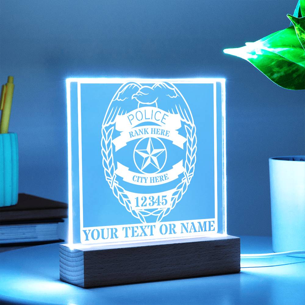 Design your personalized police shield LED acrylic plate today and add a unique name, text, or date. This customizable police force display is perfect for a police station, office, man cave, or living room, and it could be a one-of-a-kind law enforcement present for a Captain, Trooper, Lieutenant, Sergeant, Detective, Deputy, or Investigator. E.g. Police Officer work desk monogram gift for a police graduation, birthday, Christmas, anniversary, retirement, Remembrance, or Mother's Day, Father's Day.